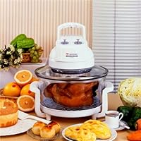 Combining portability and versatility in one compact appliance, this multi-function round-shaped convection oven can be used to bake, steam, grill, and roast. Its 12-by-12-by-7-inch, high-temperature-safe glass bowl holds up to 12 liters and seals in moisture, heat, and nutrients, plus allows for keeping an eye on the cooking process at a glance. Take the oven along to a potluck or use it in a dorm room, at the cabin, or in an RV. In addition to being lightweight and portable, the convection oven cooks food faster than traditional ovens and uses less energy. Its user-friendly control panel with handy indicator lights offers two control knobs--one for setting the 5- to 60-minute timer and another for selecting the heat up to 500 degrees F. The 1200-watt unit comes with a built-in fan that circulates heated air evenly over all surfaces and effectively maintains a consistent cooking temperature. A cooking rack comes included, which lifts food up and away from fat and oils, helping to promote lower fat cooking. The UL-approved convection oven measures approximately 12 by 12 by 15 inches and carries a one-year limited warranty.