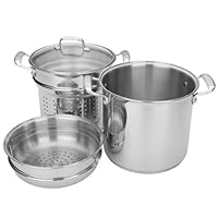 This 10 quart Stainless steel pasta cooker from MIU FRANCE can be used for a variety of cooking uses in the kitchen. It is a great pasta cooker and it is also a great steamer.The pan comes with two steamer inserts.It features 18/10 stainless steel construction with heavy duty handles riveted to eash side of the pan.The lid is glass with a riveted handle.The larger of the two inserts also has riveted handles on each side.The tri-ply bottom is designed for even heat distribution and is made from three layers of metal.The oustide layers are stainless steel with the inside layer being aluminum.The layers of metal are impact bonded to the bottom of the cooker.It is safe to be cleaner in the dishwasher.