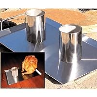 The double barrel chicken cooker takes beer-can chicken to the next level. Stainless steel construction. Unique pan design eliminates flare-ups while recirculating juices for maximum flavor and juiciness. Welded stainless cups allow you to use a variety of liquids and spices. Base measures 17 inch x 9 inch.