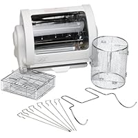 Great for poultry, fish, burgers, veggies, kabobs holds up to a 10 lb. Turkey meats self-baste in their own juices easy-to-use spit assembly 3 hour countdown cooking timer includes adjustable flat basket and exclusive round basket for air baked fries and veggies 6 kabob skewers. Roll-top door for easy access. Large viewing window. Slide-out drip tray captures run-off fat. Convenient spit assembly remover