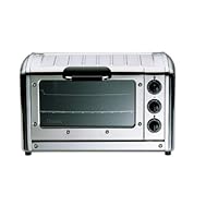 Ideal for small kitchens or studios or for extra cooking space during the holidays, this powerful 1500-watt mini oven provides an array of cooking options. Use it to defrost, bake, grill, or convection cook breakfast toast, appetizers, after-school snacks, side dishes, fish, pizza, a small batch of cookies, and much more. Three user-friendly control knobs make it easy to adjust the heat up to 450 degrees F, select the cooking function, and set the time--its 60-minute countdown timer comes with a "ready" bell to signal the end of the cooking session. The tabletop oven quickly heats up in about five minutes, and its plate-warming area makes it possible to serve warm food on a warm plate restaurant-style. Other highlights include a double-glazed cool-wall glass door, an easy-to-clean nonstick interior, a replaceable interior light, adjustable feet, and cord storage to keep countertops looking tidy. Accessories include a wire oven rack, a roasting/grilling pan, a nonstick baking tray, and a removable drip tray, as well a robust recipe book with 50 delicious ideas. Attractively housed in durable stainless steel and polished cast aluminum, the mini oven measures 13 by 17-1/2 by 9-4/5 inches.