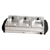 Features:Adjustable settings.3 PC clear dome lids.Power on indicator light.3 buffet trays - 2.5 quarts each.Serves as a flat warming surface perfect for hors d'oeuvres.Keeps food warm up to 185F.Brushed stainless steel surface.Dimensions: 25" x 14.5" x 6".Cool-touch handles.300 watts.